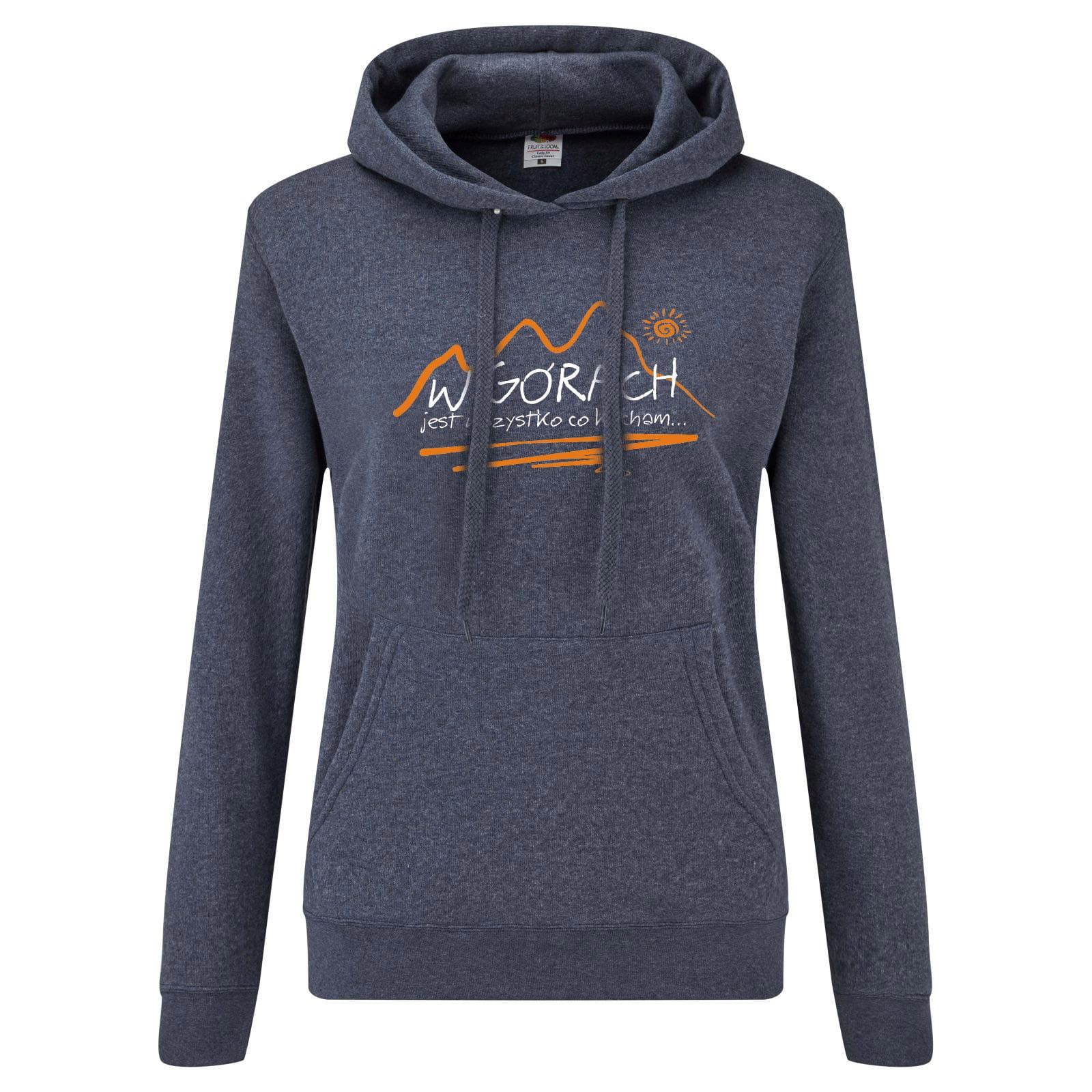 Klasyczna damska bluza z kapturem z nadrukiem W GÓRACH grafitowa, wyprodukowana na bazie najwyższej jakości bluzy firmy FRUIT OF THE LOOM, jednego z czołowych światowych producentów odzieży. Bardzo miła w dotyku, o wysokich parametrach bluza służyć będzie przez długi czas.